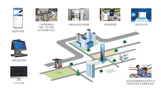 系統可用于法院、檢察院、部隊、涉密單位等對訪客來訪身份核驗要求嚴格的場合,系統支持訪客來訪提前預約,到訪通過訪客機進行訪客身份核驗和登記,系統連接公安部數據庫系統,進行法定級三要素身份驗證,確保來訪人員身份準確及人員安全。